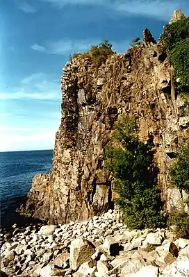 Jons Kapel ("John's Chapel") is a rock bluff in Denmark on Bornholm's west coast, about 7 kilometres (4.3 mi) north of Hasle. The formations are the result of the waves beating against the rock at a time when the sea level was considerably higher than it is today.[1] The cliff is 135 feet (41 m) in height.[2] Named after a hermit who resided on the bluff, Jon's caves are visible from the beach below the rocks.[3]