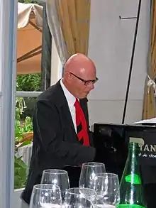 Photo of Joop Stokkermans behind the piano on Dick Bruna's 80th birthday