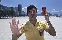 After serving as a referee for lower level matches on the beach and in stadiums, dos Santos began refereeing bigger tournaments such as the 1988 Taça Guanabara. He was known for his "no-nonsense" style.[4] He stated in an interview on 25 March 1988 with Placar that "I do not allow any type of indiscipline and demand respect." Due to this reputation, dos Santos was respected by footballers and other referees. In the 1980s, dos Santos, Válter "Bianca" Senra, Paulino Rodrigues da Silva, and Sérgio Cenedezi all faced scrutiny as the few openly gay referees of Brazil. In a 1988 match between Volta Redonda and Flamengo, dos Santos faced homophobic slurs from the crowd due to his perceived "effeminate physicality."[3]