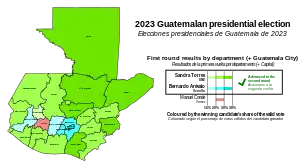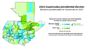 General elections were held in Guatemala on 25 June 2023 to elect the president and vice president, all 160 seats in Congress, all 20 members of the Central American Parliament, and mayors and councils for all the country's 340 municipalities. Incumbent president Alejandro Giammattei was constitutionally prohibited from running for a second four-year term.[1] However, as no presidential candidate obtained over 50 percent of the vote in the first round on 25 June 2023, a second round was held between the top two finishers on 20 August 2023: Congressman Bernardo Arévalo (the son of former president Juan José Arévalo) of the Movimiento Semilla and Sandra Torres, a former first lady representing the National Unity of Hope (UNE) party.[2] Arévalo defeated Torres in the second round with nearly 61 percent of the vote in what was seen as a landslide.[3] The ruling Vamos party won the largest number of seats in Congress.[4]