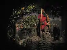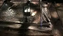 In 2001, the centre was refurbished and enlarged at a cost of £5 million, and a further investment of £1 million followed in February 2010.[3] These investments were used to "intensify the message" at Jorvik, and included such changes as extending the ride time to 12 minutes, as well as adding more high-tech elements, which included a hike in "the technology and animation elements," and increasing "the sensory stimuli to include smells, more sounds, heat, cold and damp."[4] Visitors were taken back to 5:30 pm 25 October 975 AD in a time-capsule, and then embarked on a tour of a reconstructed Viking settlement which includes voices speaking in Old Norse, as well as aromas and "life-like animated figures, made by laser technology from skeletons found on the site."[5] Beyond this is an extensive museum area, which combines an exhibition of some 800 finds from the site with interactive displays and the opportunity to learn about tenth-century life and to discuss it with "Viking" staff. Among the exhibits is a replica of the Coppergate Helmet, which was found near the site of the centre and is now in the Yorkshire Museum. The third incarnation of Jorvik was opened on 13 February 2010, coinciding with the start of the annual Viking Festival in York. The attraction was completely rebuilt following devastating flooding in December 2015, re-opening on 8 April 2017 with the Return of the Vikings. The timeline was moved, so visitors now experience a September day in 960AD, and the ride slowed down, extending the ride time to 16 minutes.