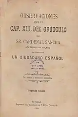 - ↑ full title Observaciones que al capitulo XIII del opúsculo del cardenal Sancha ha inspirado a un ciudadano español, Sevilla 1899