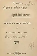 Between 1873 and 1935 Roca published some 15 booklets, formatted either as collections of essays, often based on his earlier sermons, or as pamphlets.[68] They usually dwelled on religion and politics; the author used to offer his – routinely highly critical – diagnosis of Spanish public life, and advanced his own suggestions for the future. Some were responses to specific issues, persons or episodes;[69] some contained more general lectures.[70] Roca used to sign with various, easily attributable pen-names,[71] though he was best known as "Magistral de Sevilla";[72] his late writings were published under his own name.[73] The booklet which made particular impact and caused nationwide controversy was Observaciones que el capitulo XIII del opúsculo del cardenal Sancha ha inspirado a un ciudadano español (1899).[74] ¿Se puede, en conciencia, pertenecer al partido liberal-conservador? (1912) and ¿Cuál es el mal mayor y cuál es el mal menor? (1912) also gained sort of notoriety, namely when the Vatican voiced its skepticism as to the political intransigence advanced; moderate Catholics were quick to stigmatize them as “doctrinas condenadas por Su Santidad”.[75]