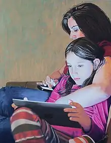 Another significant piece of Caro´s is the pastel Maternity, juried at the 10th Annual Northeast National Pastel Exhibition and receiving the "Outstanding Portrait Award". According to jurors this painting represents "a metaphor of modern family, the interplay between the oldest of bonds between a mother and daughter and the new technology, the tension between physical connection and mental distance; each of the two is in her own universe on her owm device yet both warmly bonded together".[19][41]