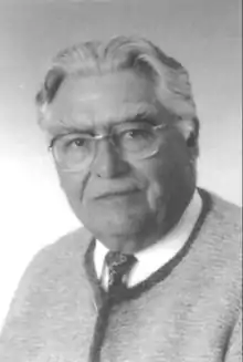 In fall 1944 Germans had to flee from the Banat; Josef's father was killed and the family were dispossessed of all their belongings. His brother joined combat units, while his mother and sister were interned in Serbian camps. Josef managed to escape with his school class by way of Budapest and Vienna to Sankt Pölten,[1] where he graduated from the teacher training college.[2] Continuing his journey, he became caught between the closing East and West fronts in the Czechoslovak Republic. After barely surviving, he tried to return to his hometown on foot. Being arrested and freed several times, he successfully crossed the Alps and reached Carinthia. There he was taken into the custody of the British army and was informed of the fate of his hometown. After his release he became an elementary school teacher in Carinthia. Meanwhile, his mother and sister had arrived in Vienna and were able to make contact with him through the refugee relief program of the Austrian Caritas organization.[2]