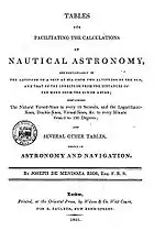 Josef (also José or Joseph) de Mendoza y Ríos (1761–1816) was a Spanish astronomer and mathematician of the 18th century, famous for his work on navigation. The first work of Mendoza y Ríos was published in 1787: his treatise[1] about the science and technique of navigation in two tomes. He also published several tables for facilitating the calculations of nautical astronomy and useful in navigation to calculate the latitude of a ship at sea from two altitudes of the sun, and the longitude from the distances of the moon from a celestial body.