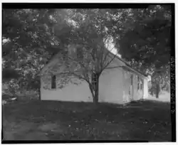 The Joseph Blakeslee House stood at the northeast corner of Barnes Road (Connecticut Route 68) and Research Parkway in northeastern Wallingford. The parcel which it stood is nearly surrounded by commercial development. It was a 1+1⁄2-story wood-frame structure, with a gabled roof, central chimney, and clapboarded exterior. It was oriented facing east, with a low stone retaining wall in front. Its main facade was three bays wide, with a center entrance that was once topped by a four-light transom window. The trim at the building corners and around the window and door openings was simple. The interior followed a fairly typical period central chimney plan, although the place typically occupied by a staircase in the entrance vestibule contained a closet. The staircase to the attic was located in the rear of the house, between the kitchen and buttery.[3]