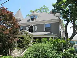 The Joseph K. James House is a historic house at 83 Belmont Street in Somerville, Massachusetts. This 3 story wood-frame house was built in 1893-4 for Joseph Knightley James, a partner in a local soap manufacturer. It is one of Somerville's best examples of Queen Anne and Colonial Revival styling. It has a rectangular Colonial Revival form with a pitched hip roof, with a Queen Anne turret and chimney tops. The front porch is supported by clusters of columns and features a pedimented gable over the entry that is decorated with a hand-carved lion's head surrounded by a floral design.[2]