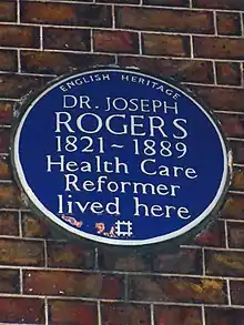 In 1861 Rogers came before the select committee of the House of Commons, speaking on the supply of drugs in workhouse infirmaries, and his views were adopted.[2] Much of the evidence on which Gathorne Hardy relied in pushing for the Metropolitan Poor Act 1867 came from Rogers.[5] In 1868 zeal for reform brought him, however, into conflict with the guardians, and the president of the poor-law board, after an inquiry, removed him from office. In 1872 he became medical officer of the Westminster Infirmary. Here also the guardians resented his efforts at reform and suspended him, but he was reinstated by the president of the poor-law board, and admirers presented him with a testimonial.[2]
