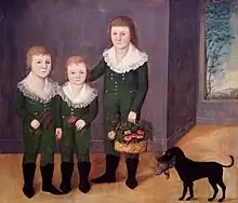 In his painting The Westwood Children (now in the National Gallery of Art), Johnson depicts the male children of Margaret and John Westwood, who was a successful Baltimore stagecoach manufacturer. The painting is stylized and depicts the three children holding flowers in their hands, accompanied by the family dog, which holds a bird in its mouth. The children have chilled, expressionless stares, although the youngest child seems to be on the verge of smiling.