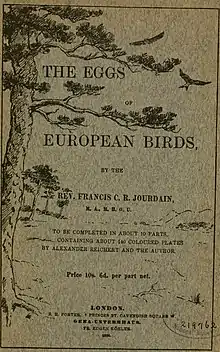 The Jourdain Society is or was a controversial society based in the United Kingdom, its aims being ‘the advancement of the science of oology’, the collection and study of intact birds' eggs. Established in 1922 as the British Oological Association, it changed its name in 1946 in memory of distinguished ornithologist and oologist Reverend Francis Jourdain (1865–1940).[1][2][3] The society was a social gathering that held regular dinners, established as an elitist club, which did not admit women and professional dealers.[4][5][6]