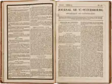 The Journal de St.-Pétersbourg or Journal de Saint-Pétersbourg was a French-language newspaper, published in Saint Petersburg, Russia, with varying periodicity and some interruptions, from 1825 to 1914. For at least some of this period it was an official or semi-official organ of the Russian Foreign Ministry.[1][2]
