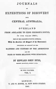 Journals of Expeditions of Discovery into Central Australia[lower-alpha 1] is a Non-fiction novel written by the named explorer and colonist of the early Australia and other varies British colonies, Edward John Eyre. The main content of this book is derived from the travelogue of Mr. Eyre’s one year expedition trip started from Adelaide into mainland of the country and ended after he boarded a ship in King George’s Sound heading back to Adelaide. After returning, Eyre were suggesting to the Governor George Gipps the idea to lead another exploration from Moreton Bay to Port Essington but was instead appointed to resident magistrate and protector of Aborigines at River Murray and the experience and knowledge of dealing with the Aboriginals from this position form the basis of the sections of Account of the Manners and Customs of the Aborigines and the State of Their Relations with Europeans part of the book.[2]