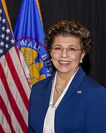 Jovita Carranza (born June 29, 1949) is an American businesswoman who served as the 26th Administrator of the Small Business Administration from 2020 to 2021, having previously served as the 44th Treasurer of the United States from 2017 to 2020. She was appointed to both roles by President Donald Trump. Before that she served as the Deputy Administrator of the Small Business Administration from December 2006 to January 2009.[3][4] Appointed by President George W. Bush, Carranza was unanimously confirmed by the U.S. Senate. Prior to her first appointment to the SBA, Carranza served as Vice President of Air Operations for United Parcel Service (UPS) at its facility in Louisville, Kentucky.[5]