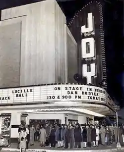 On February 7, 1947, the Joy Theater opened at a cost of $275,000, with seats for 1,250 patrons. Hailed as "New Orleans' newest and most modern film temple,"[2] the theater was equipped with a crying room, a glass-enclosed area behind the back row that enabled parents with young children to enjoy the show without disturbing the other patrons.[3][4] The Joy was built by long-time theater operators Joy Houck (the theater's namesake) and Levere Montgomery, Sr. The architect was B. W. Stevens. Lover Come Back, starring Lucille Ball, was the opening feature.[4]
