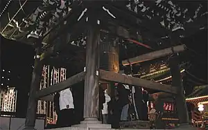 The custom of ringing the temple bell 108 times in Zen temples originated in the Zen temples of the Song dynasty in China. The custom was introduced to Japanese Zen temples during the Kamakura period (1185-1333), and at that time the temple bells were rung 108 times in the morning and evening each day. In the Muromachi period (1333-1573), the ringing of the temple bell 108 times in Zen temples became an event unique to Japanese Zen temples, held only on New Year's Eve, and was established as "Joya no kane".[1][2][3] In Zen temples it is performed at midnight on New Year's Eve to ward off the bad luck from northeastern direction (see Devil's gate (superstition)).