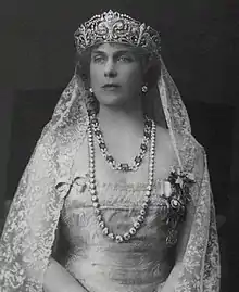 - Fleurs-de-lis tiara, designed by the Spanish jeweller Ansorena. King Alfonso XIII gave it to Princess Victoria Eugenie for their wedding in 1906. It is made of diamonds and mounted in platinum. It forms three fleurs-de-lis, the heraldic emblem of the Bourbons, joined by scrolls and leaves. In 1910 it was modified so that it could also be worn open. The fleurs-de-lis can also be used independently as brooches. It is known within the family as La buena (transl. The good one). As their most ostentatious tiara –although not the most valuable–, it has only been worn by the wives of the heads of the house.[lower-alpha 1] Queen Victoria Eugenie wore it and was portrayed with it on numerous occasions.[lower-alpha 2] Her daughter-in-law María de las Mercedes wore it at the Coronation of Elizabeth II in 1953, as one of the very few occasions she used it. Queen Sofía and Queen Letizia have worn it on exceptional solemn occasions, especially in state visits of foreign heads of state to Spain or in state visits to foreign monarchies. Queen Letizia wore it at the state banquet for the Enthronement of Emperor Naruhito in 2019.