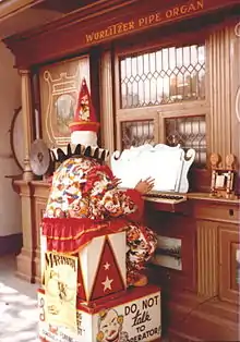 The park had a Mammoth Military Band Organ, also known as a Wurlitzer Style #160, which was the largest of Wurlitzer’s early models. It was built around 1905 by the DeKleist Musical Instrument Works and was sold by the Rudolph Wurlitzer Company. It contained 486 wood and brass pipes and used two perforated paper music rolls, producing the effect of a military brass band of 20 to 25 musicians. This particular model was designed primarily for the roller rink industry. In 1915, it was taken back to the Wurlitzer factory and modified into a Wurlitzer Style 165. It was sold to W.P. Brown of Coffeyville, who owned and operated the Silurian Springs Bath House, which also featured a roller rink, for which the organ provided music for several years. In the 1930s it went into storage; it was heavily water damaged, and some of its brass parts were later stripped off during World War II scrap metal drives. In 1948, Jess Gibbs of Parsons, purchased it and began the painstaking work of restoration. In 1950 he sold the restored instrument to the Ottaway family, who installed it in the park. They added Louie, an animatronic clown who sat before the keyboard and "played" it. Louie and the Mighty Wurlitzer had been a fixture there ever since, creating a sound that resonated through the entire park. It was one of only two mammoth model organs still in existence and, until the park closed, was the only one in public view. Its current whereabouts and conditions are unknown.