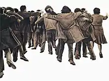 The study of crowds begins to develop in this first phase of his work.[6] We should note here that his crowds, generally seen from above, are made up of individuals, they are not a homogeneous mass; rather he presents a duality between the group and the individual. They contain or suggest opposing binaries such as freedom and alienation, solitude and community, conformity and disconformity, and so on.[12] Furthermore, the mass is made up of characters that are points of attention;[15] this is how the author plays with the attraction, repulsion and groupings among them.