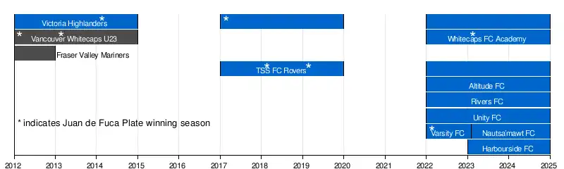 Beginning in 2022, League 1 British Columbia was established as a new semi-professional league in British Columbia (with some of the former PDL clubs joining the league - TSS Rovers, Victoria Highlanders, and the Whitecaps FC Academy). It was announced that the club whose teams accrue the greatest number of points across both the men’s and women’s divisions in an aggregate table would win the Juan de Fuca plate.[18][19]