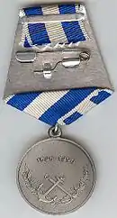 The medal is suspended by a ring through the award's suspension loop to a standard Russian pentagonal mount covered with an overlapping 24 mm wide white silk moiré ribbon with two 7 mm wide blue stripes located 1 mm from the ribbon's edges.[1]