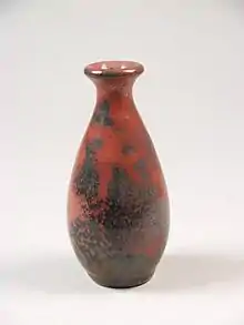 Vase with elongated wall and spreading neck covered with gray-red glaze by Judith Laqueur-Révész, 1952