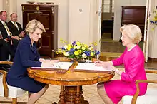 After the Coalition won the 2013 federal election, new Prime Minister Tony Abbott confirmed Bishop as Minister for Foreign Affairs; she was sworn in by Governor-General Quentin Bryce on 18 September 2013. She became the only female member of the cabinet and was given the third-highest rank, after Abbott and Deputy Prime Minister Warren Truss.[35] In the months following her appointment several media reports claimed that Bishop, along with Social Services Minister Scott Morrison, were regarded internally as the best performing ministers in the Government.[36]