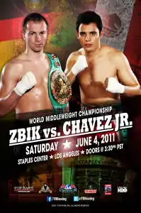 Julio César Chávez Jr. vs. Sebastian Zbik was a Middleweight championship fight for the WBC Middleweight Championship.[1] It has been the first time that the son of legendary boxing Champion Julio César Chávez, fought for a world title, Chávez went on to become the new WBC Middleweight Champion. The bout was on June 4, 2011, at Staples Center, in Los Angeles, California and was broadcast on HBO.[2]