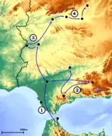 Throughout the day the situation across the province was getting only slightly more clear, with rebels apparently gradually getting the upper hand. In some locations the coup succeeded, e.g. Marchena (10,000 inhabitants, some 50 km away from Seville) was seized by a rebel Guardia Civil detachment sent from Ecija.[77] In Osuna so far ambiguous Guardias left their barracks, dispersed the crowd, deposed authorities and declared state of war.[78] Communication with Cádiz, now fully controlled by the rebels, was already firm. However, there was no link with Córdoba, which remained an isolated island of insurgency; this was because Carmona, the city on the Seville-Córdoba road, was controlled by the loyalists. Also Utrera (25,000 inhabitants, 30 km away) remained the loyalist stronghold,[79] effectively blocking access towards the stalemated Málaga.