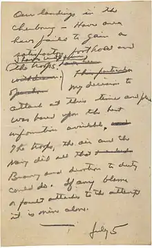 Amid last minute delays caused by weather and disagreements over strategy and timing, Eisenhower wrote a short message to be issued in case the invasion was repulsed.[2][12] The message was written with a pencil on a small notebook during the afternoon of June 5, Eisenhower having given the final order to proceed with the invasion that morning.[5][2] He tore off the sheet and kept it in his wallet. Eisenhower rediscovered the note on July 11 and showed it to naval aide Harry C. Butcher, who persuaded Eisenhower to preserve the note for posterity; it is now in the collection of the presidential library.[5] The note stated that "if any blame or fault attaches to the attempt it is mine alone".[12] In his haste Eisenhower misdated the message July 5.[5]