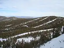June Mountain ski area consists of two mountains, Rainbow Mountain, with an elevation of 10,040 feet (3,060 m), and June Mountain, with a peak of 10,090 feet (3,075 m). The total vertical rise from the lower ticket office to the summit of June Mountain is 2,545 feet. June Mountain averages 250 inches of snowfall a year along with some snowmaking capabilities and normal season runs from December through April. The ski area covers 1,500 acres and has 35 named trails of which 20% are advanced, 45% are intermediate, and 35% are beginner. June Mountain is also home to two terrain parks and a 22-foot superpipe.[6] Many opportunities exist, however, for riders to explore the trees that cover much of the ski areas total acreage and access fresh snow off piste. June Mountain has also established itself as a favorite spot among locals due to its small crowds and easy access to powder following a storm.[9]