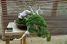 Shimpaku Juniper are one of the most popular species for bonsai within the bonsai community. Its attractive foliage and beautiful bark make this one of the top candidates for bonsai. Many wild trees have been collected in Japan, making it extremely rare to find growing wild. In fact, today the Shimpaku junipers growing in the wild in Japan face extinction due to over collecting.[3] Shimpaku was and is very dangerous to collect. Many of the best Shimpaku live only in remote cliff areas. It is said that the first Shimpaku to be collected in the wild came from the Ishizuchi mountain range on Shikoku Island. Collected Shimpakus are known for their deadwood, called jin and shari in the bonsai community. Many bonsai masterpieces are Shimpaku Junipers. Masahiko Kimura is known for having many outstanding shimpaku.[4]
