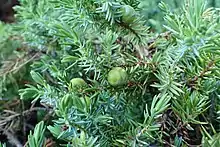 The seed cones are berry-like, green ripening in 18 months to purple-brown; they are spherical, 8–9 mm diameter, and have three or six fused scales in one or two whorls of three; the three larger scales each bear a single seed. The seeds are dispersed when birds eat the cones, digesting the fleshy scales and passing the hard seeds in their droppings. The pollen cones are yellow, 5 mm long.[3]
