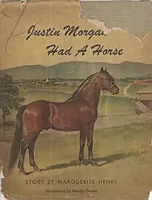 Justin Morgan Had a Horse is an American children's historical novel by Marguerite Henry, illustrated by Wesley Dennis and published by Wilcox & Follett of Chicago in 1945.[1] It concerns the real figures of Justin Morgan and his bay stallion Figure, who lived in Vermont in the late eighteenth century.[2] It was a runner-up for the Newbery Medal in 1946.[3]