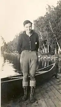 She met Bill Kerfoot, the son of Hamline University's president, whose foreign service ambitions were dashed in the Depression camped on a beach, desperate for work. Justine offered him room and board in exchange for resort work.[3] In 1934 she married Bill Kerfoot. They had 3 children; Neal (1935-1935), Bruce, Pat and Sharon.[5] She once led a winter hunting trip while 8 months pregnant. They eventually divorced. The lodge burned in 1953 and the family rebuilt it. Their son Bruce bought the lodge from his parents in the late 1960s. He ran it and in 2013 announced his intentions to sell it.[11] He ran it until he sold it in 2016 (except for handed operations over to a son, Lee, in 2001, but took back control in 2008.)[12][13][11]