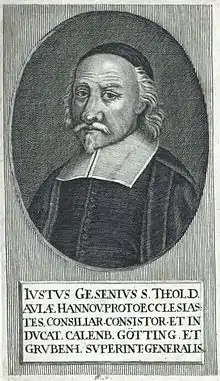 Justus Gesenius (6 July 1601, Esbeck (near Elze), in the principality of Calenberg – 18 September 1673, Hanover) was a Lutheran theologian of the seventeenth century, known for his catechisms.