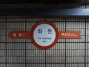 Jwacheon Station (Korean: 좌천역; Hanja: 佐川驛) is a station of Busan Metro Line 1 in Jwacheon-dong, Dong District, Busan, South Korea. The station is unrelated to the Jwacheon Station of Korail.