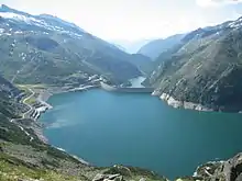 The Kölnbrein Dam is an arch dam in the Hohe Tauern range within Carinthia, Austria. It was constructed between 1971 and 1979 and at 200 metres (660 ft) high, it is the tallest dam in Austria.[1] The dam's reservoir serves as the primary storage in a three-stage pumped-storage power system that consists of nine dams, four hydroelectric power plants and a series of pipeline and penstocks. The complex is owned by Verbund power company and is referred to as the Malta-Reisseck Power Plant Group. The installed capacity of the group is 1,028.5 MW and its annual generation is 1,216 gigawatt-hours (4,380 TJ).