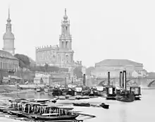 View of the Brühl's Terrace around 1865, from left to right: Brühlsche Galerie, Hausmannsturm, Brühlsche Bibliothek (covert), Dresden Cathedral, Semper Gallery (covered), Königliches Hoftheater, before that the old Augustus Bridge.