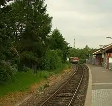 The Königstein Railway then passes through the Kelkheim municipal forest (Stadtwald) and reaches the southern boundary of Königstein, which is also the beginning of Hochtaunuskreis. After passing through the halt of Schneidhain and a 180° turn to the east, the line reaches Königstein station and thus the end of the line.