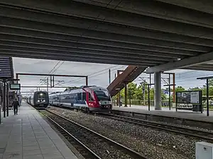 Køge station is the principal railway station serving the town of Køge 39 km southwest of Copenhagen on the island of Zealand, Denmark.[1] It is located in central Køge, situated between the historic town centre and the Port of Køge, and immediately adjacent to the Køge bus station.