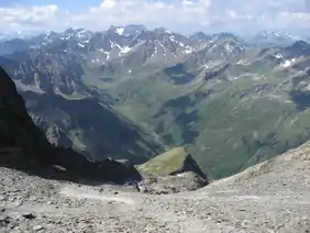 ![]() View of the Malfont valley in the Verwall with the Küchlspitze (annotated) in the far distance. | |