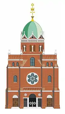 The synagogue was built on the initiative of the Progressive Jews, according to the plans of architect Albert Grau (1837–1900) of Breslau (now Wrocław), a student of Georg Gottlob Ungewitter, in the style of the Neo-Moorish and Brick-neo-Gothic.[1][2][4]