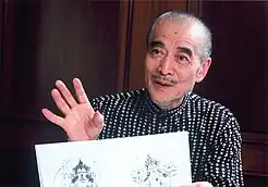 Sugiura's consciousness of Asia began as a child with his attraction to Asian folk music and grew during a his time teaching at Ulm, where he acquired a new found self-awareness about Asian identity.[27] However, Sugiura's preoccupation with the question of defining Asian design and iconography was informed by his trip to India in 1971 when he was sent under UNESCO Development Program in order to survey the state of Indian printing and create seminars on printing development in the country.[28] Sugiura then began producing and compiling research on ancient Asian cosmologies, calligraphic traditions, iconography, and general culture that spanned across the multiple countries within the Asian continent. The regional breadth of his research interests speak to one of the core tenets of his theories — many of the multilayered symbols and iconography of various Asian countries have shared origins that are independent from Western traditions.[29] Through the Asian Cultural Centre for UNESCO, Sugiura has published his research in the periodicals Asian Culture and APC. He has also created award-winning luxurious book sets that evidence his deep understanding of these cosmologies, such as The Mandalas of the Two Worlds (伝真言院両界曼荼羅) (1977) and Tibetan Mandalas - The Ngor Collection (西蔵曼荼羅集成:チベット・マンダラ) (1983). In addition to his leadership of the Asian Design Institute, Sugiura continues to promote the study of Asian design through lectures, academic publications, and exhibitions.[30]
