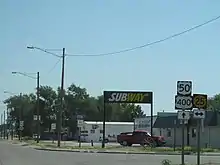In a June 6, 1936 resolution, K-25 was slightly to eliminate two sharp curves, north of Lakin along the Kearny–Wichita county line.[12] Between February 1937 and January 1938, US-270 was extended into Kansas, and overlapped K-25 from the Hugoton to Ulysses.[13][14] Then in a May 18, 1981 resolution, the US-270 designation was removed.[15][16] In a September 12, 1938 resolution, a 13.7-mile-long (22.0 km) section of K-25 was realigned southwest of Lakin to eliminate four sharp curves.[17] In a November 12, 1947 resolution, K-25 was realigned in and east of Leoti.[18] In a March 30, 1950 resolution, K-25 and US-270 was realigned slightly east where it crosses the South Fork Cimarron River, just north of the Grant–Stevens county line.[19] In a February 13, 1952 resolution, it was slightly realigned, southwest of Russell Springs. Also a new bridge was built across the Smoky Hill River.[20] In two separate August 11, 1954 resolutions, Logan and Thomas counties had finished bringing the section of roadway, from west of Monument north to Colby, up to state highway standards. The section then became a realignment of K-25.[21][22] In a March 9, 1955 resolution, the highway was realigned south of Atwood to eliminate four sharp curves.[23]