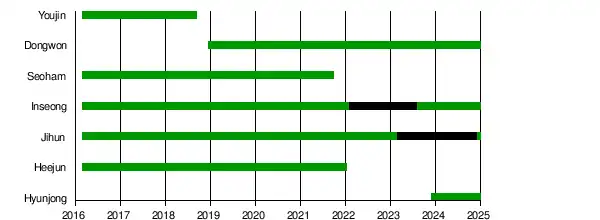 - ↑ "KNK To Temporarily Promote As 4-Member Group Due To Youjin's Panic Disorder". Soompi. Retrieved April 19, 2018.