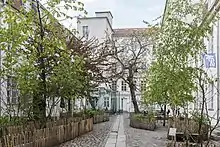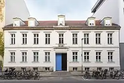 The institute was founded July 1, 1991, less than two years after the fall of the Berlin Wall, in a derelict Berlin factory that once produced margarine.[2] Its founders were Klaus Biesenbach, thena 25-year old medical student, the Swiss actress Alexandra Binswanger, Clemens Homburger, an architecture student,[3] Philipp von Doering, a student of communications design,[3] and Alfonso Rutigliano, an architecture student.[3][4][5][6] The institute's building, which it still occupies, is located at Auguststrasse 69, in the Mitte district of Berlin.[2] KW's original buildings included the margarine factory and an additional building at its rear that had produced quartz lamps and spray paint. These were leased to the institute in 1991, for 25 years, by the Wohnungsbaugesellschaft Mitte, a local housing association.[7][8] A dispute over the legality of the leases issued by the Wohnungsbaugesellschaft Mitte and a restitution effort related to the ownership of the buildings between the end of World War II and the establishment of the German Democratic Republic developed in the 1990s.[7] In 1995 a fund associated with the German State Lottery purchased the building and leased it to the institute.[2] The Kunst-Werke part of the institute's name is a play on words, referring literally to artworks and metaphorically to the idea of a public utility that produces art.[2][7]