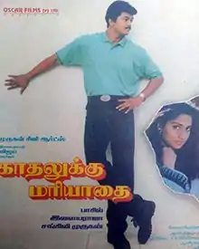 Kadhalukku Mariyadhai (transl. Respect for Love) is a 1997 Indian Tamil-language musical romantic drama film directed by Fazil. It is the Tamil remake of Fazil's own Malayalam film Aniyathipraavu (1997). The film stars Vijay and Shalini (reprising her role from the original), while Sivakumar, Srividya, Manivannan, Dhamu, Charle, Thalaivasal Vijay and Radha Ravi play supporting roles. The film tells the story of a couple of differing backgrounds and beliefs and how they unite amidst the opposition of their families. The music was composed by Ilaiyaraaja with cinematography by Anandakuttan. The film was released on 19 December 1997. It received positive reviews and became a box-office blockbuster. It was also Shalini’s first Tamil film as a leading actress, having previously acted as a child artist.