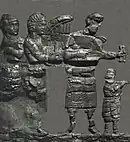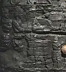 The adorants are dressed in knee-length tunics, with long boots over trousers, suggesting clothing styles similar to those found in the paintings of Penjikent, and wear shoulder ribbons which have been associated with Hephthalites nobility.[8] The gate is dated to the first half of the 6th century CE (500-550 CE), and the destruction of the palace is attributed to the Islamic conquest of Samarkand in 712 CE.[8][10]