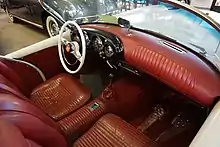 Several changes were necessitated to put the car into production. Only two of these angered the designer but were deemed necessary to meet vehicle regulations in several states—raising the headlights four inches and adding turn signals below them. Other alterations included separate lids for the trunk and top well instead of the one-piece lid on the prototype, a one-piece windshield without a "sweetheart dip" in place of a split windshield, an amended interior and a dashboard display with the instruments clustered ahead of the steering wheel instead of spread across the panel.[7] Interior features included color-keyed vinyl bucket seats, available in red, white, black, or Pine Tint (green), and a carpeted floor.[a 3][10] Seat belts, which were not widely available on American cars at this time, were listed as an option, however, there were no attachment points built into the frame or body.[4]